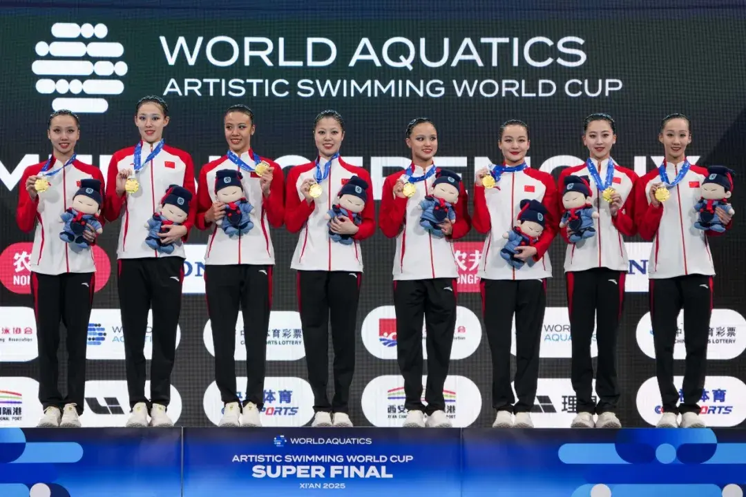 6月14日,2025年世界泳联花样游泳世界杯总决赛在西安奥体中心进行。中国队在当日举行的四项比赛中收获三金。